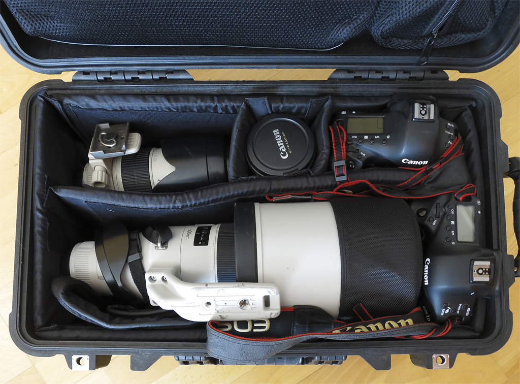 Configurando la maleta en casa, vemos que es muy espaciosa y no presenta un problema llevar dos cuerpos de la serie 1D de Canon (los más grandes de la serie réflex), un 17-40 mm, un 70-200 mm y un 500 mm f4, además, en la parte de arriba,lo que consideramos como tapa, tenemos un bolsillo para guardar nuestro portátil y otro bolsillo par cargadores, discos duros, etc.
