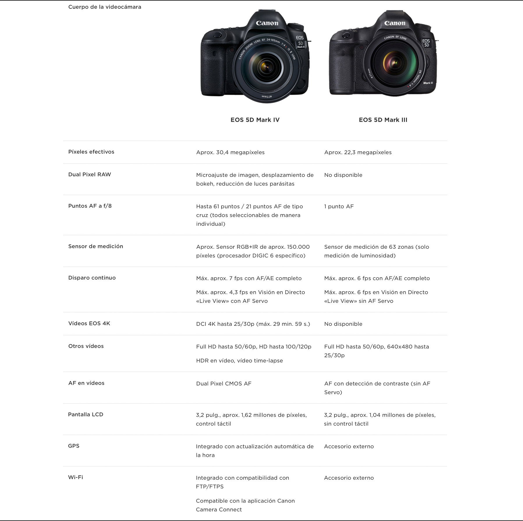 Una máquina que evoluciona en algunos aspectos a partir de la nueva de la 1DX MarkII con sistemas similares de enfoque y mejora notable en el rango dinámico, que la convierten, quizás,  en la cámara más polivalente de la gama de Canon. Estas son sus especificaciones con algunas apreciaciones que presenta 21 diferencias con respecto a la 5DmarkIV